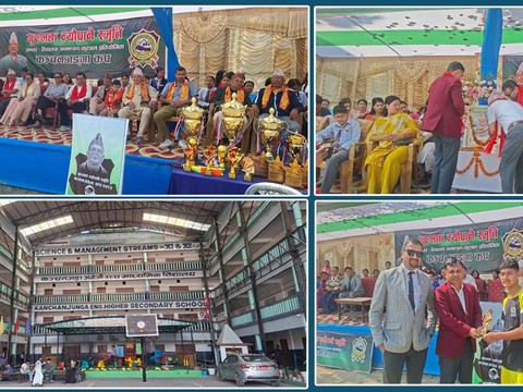 बिर्तामोड । झापाको बिर्तामोड–४ को कञ्चनजङ्गा इङ्लिस सेकेन्डरी स्कुलको आयोजनामा भएको प्रथम गुरुभक्त न्यौपाने मेमोरियल इन्टर स्कुल नकआउट फुटबल प्रतियोगिता २०८२ को उपाधि निदी सेकेन्डरी स्कुलले हात प ...