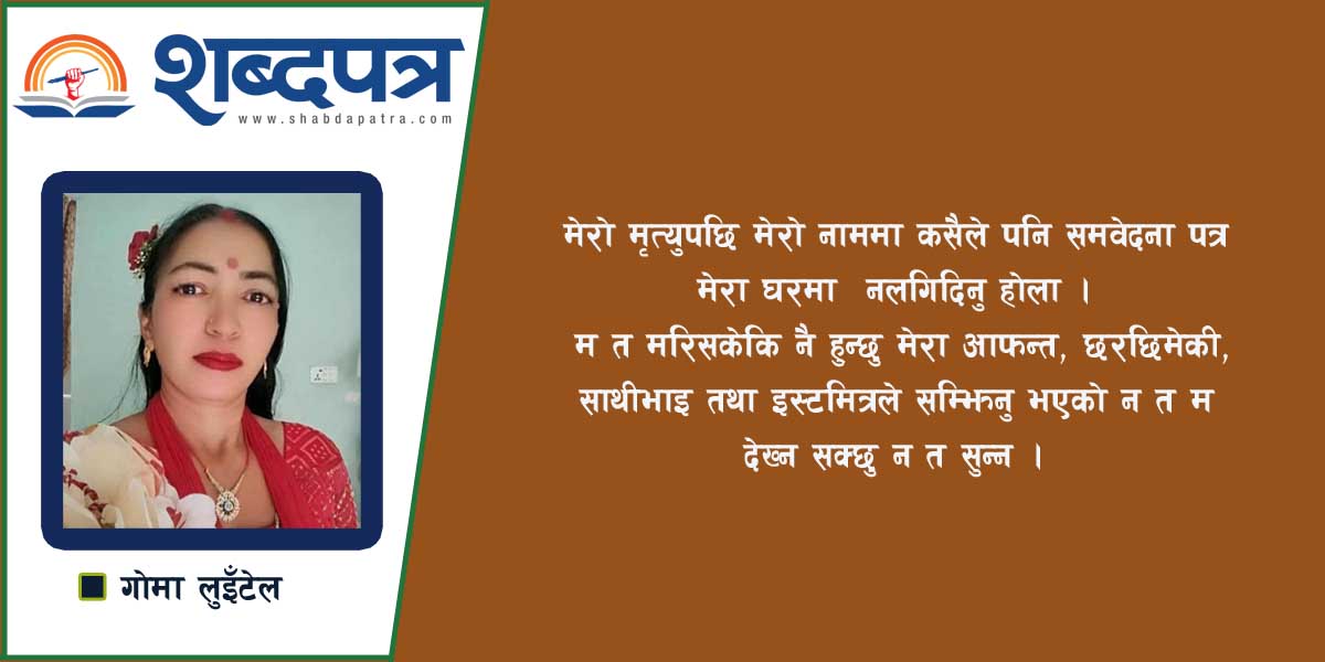 जब यी सबै घटना क्रमहरु म आफैं नियालेँ तब मैले निर्णय गरेकी छु मेरो मृत्युपछि मेरो नाममा कसैले पनि समवेदना पत्र मेरा घरमा नलगिदिनु होला । म त मरिसकेकि नै हुन्छु मेरा आफन्त, छरछिमेकी, साथीभाइ तथा इस्टमित्रले सम्झिनु भएको न त म देख्न सक्छु न त सुन्न ।