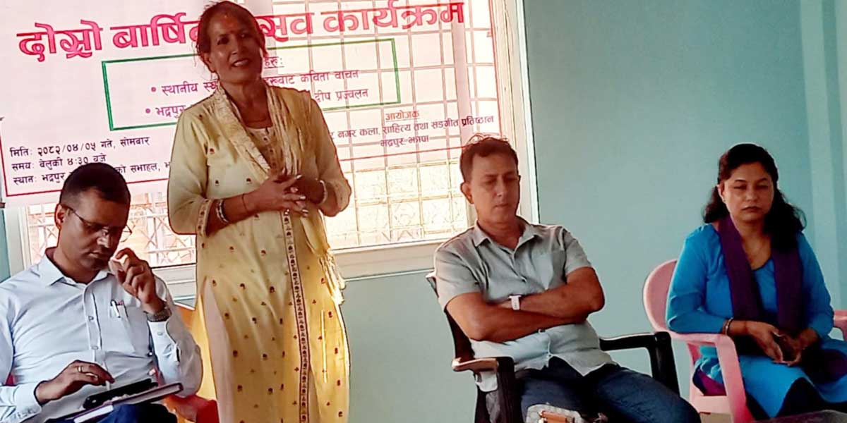 भद्रपुर नगर कला, साहित्य तथा संगीत प्रतिष्ठानका कार्यवाहक अध्यक्ष फणिन्द्र पोखरेलको अध्यक्षतामा सम्पन्न कार्यक्रममा प्रमुख अतिथि उप–प्रमुख राधा कार्की, प्रशासन प्रमुख सुनिल निरौला र साहित्यकार चूडामणि वशिष्ठले शुभकामना मन्तब्य राखेका थिए ।