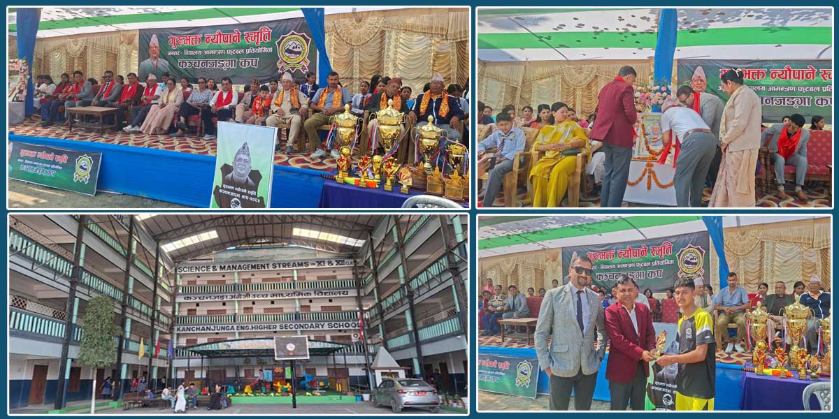बिर्तामोड । झापाको बिर्तामोड–४ को कञ्चनजङ्गा इङ्लिस सेकेन्डरी स्कुलको आयोजनामा भएको प्रथम गुरुभक्त न्यौपाने मेमोरियल इन्टर स्कुल नकआउट फुटबल प्रतियोगिता २०८२ को उपाधि निदी सेकेन्डरी स्कुलले हात प ...