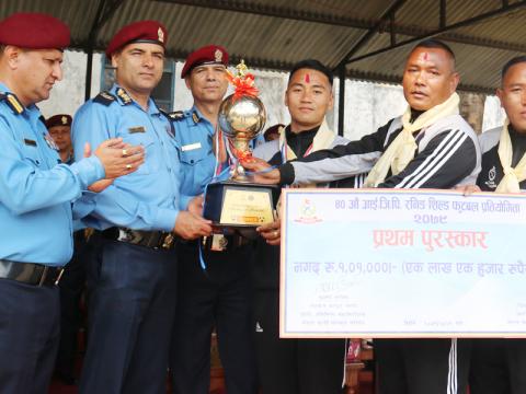 बिराटनगर।१ नम्बर प्रदेश प्रहरी कार्यालय बिराटनगरका फुटबल टिमका बिजयी खेलाडीहरुलाई प्र ...