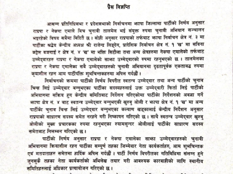 झापा । राष्ट्रिय प्रजातन्त्र पार्टीले झापामा पार्टीको निर्देशन विपरित गएका भन्द ...