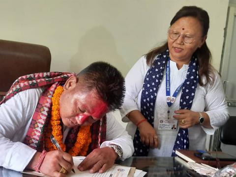 अर्जुनधारा । झापाको अर्जुनधारा नगरपालिकामा नवनिर्वाचित मेयर बलदेवसिंह गोम्देन ता ...