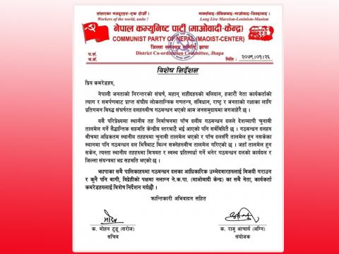 झापा । नेपाल कम्युनिष्ट पार्टी (माओवादी केन्द्र) झापाले गठबन्धनमा आवद्ध उम्मेद्व ...