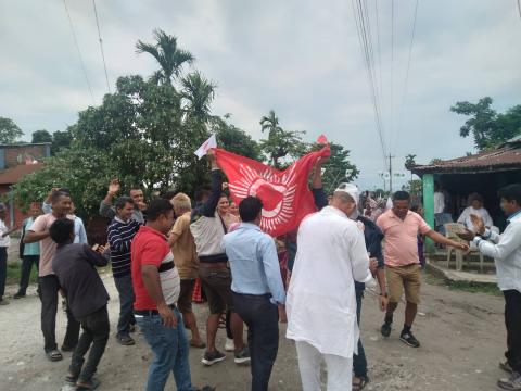 मेचीनगर । एमालेको घरदैलो कार्यक्रममा गाँउमा मजदुरहरू छमछमी नाच्दै, गाउँदै हिड्न ...
