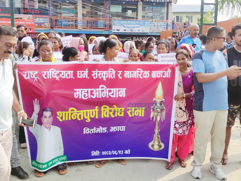 बिर्तामोड । मेडीकल व्यवसायी दुर्गा प्रसाईलाई मोसो दलेको बिरोधमा समर्थकहरुले झापा ...