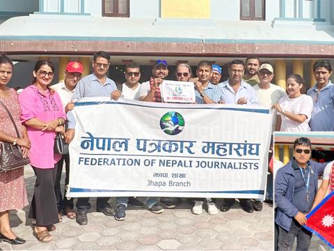 झापा। झापाका फोटो पत्रकार सरद जोशीले नेपाल पत्रकार महासंघको झण्डा लिएर हिम ...