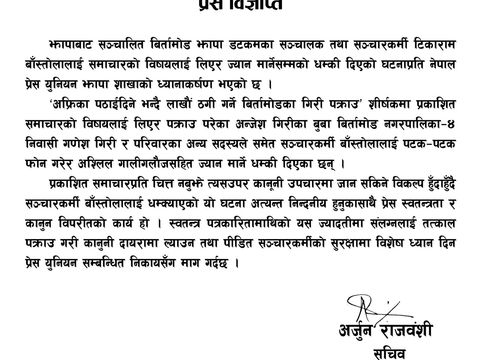 बिर्तामोड । समाचारको विषयमा सञ्चारकर्मी टिकाराम बाँस्तोलालाई ज्यान मार्ने धम्की ...