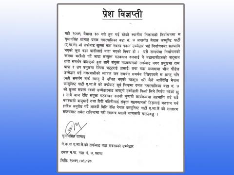 दमक । नेकपा एमालेको तर्फबाट दमक वडा नं–७ को खुल्ला वडा सदस्यका उम्मेद्वार ...