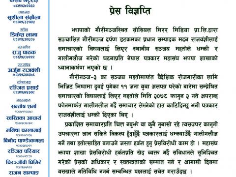 लक्ष्मीपुर।पत्रकार मदन राजवंशीलाई धम्की तथा गालीगलौज गरेको घटनाप्रति नेपाल पत्रकार मह ...