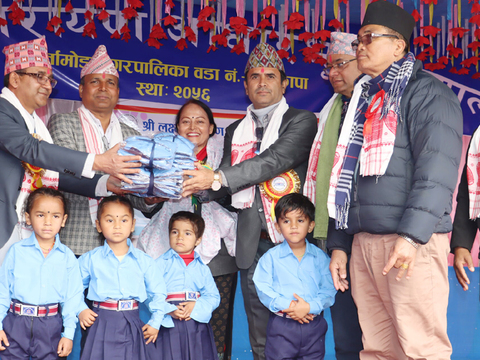 बिर्तामोड । झापाको बिर्तामोड नगरपालिकाले कक्षा ५ सम्मका विद्यार्थीलाई पोशाक वितर ...