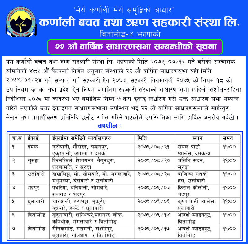 कर्णाली (साकोस) विर्तामोड–४ झापाको २२ औं वार्षिक साधारणसभा सम्बन्धीको सूचना