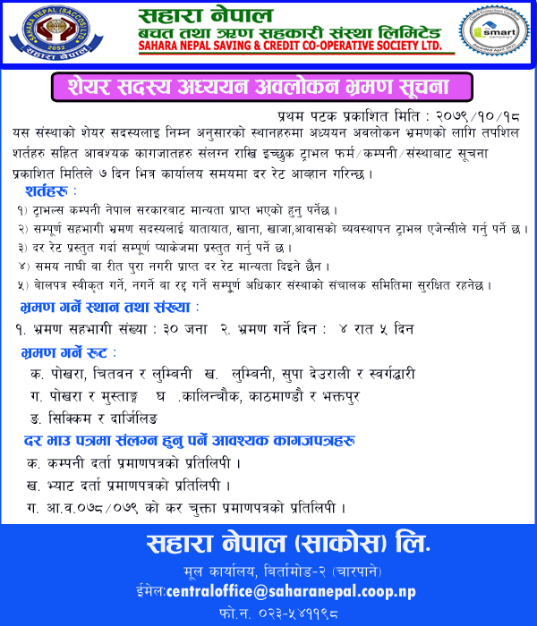 यस संस्थाको शेयर सदस्यलाइ निम्न अनुसारको स्थानहरुमा अध्ययन अवलोकन भ्रमणको लागि तपशिल शर्तहरु सहित आवश्यक कागजातहरु संलग्न राखि इच्छुक ट्राभल फर्म/कम्पनी/संस्थाबाट सूचना प्रकाशित मितिले ७ दिन भित्र कार्यालय समयमा दर रेट आव्हान गरिन्छ ।