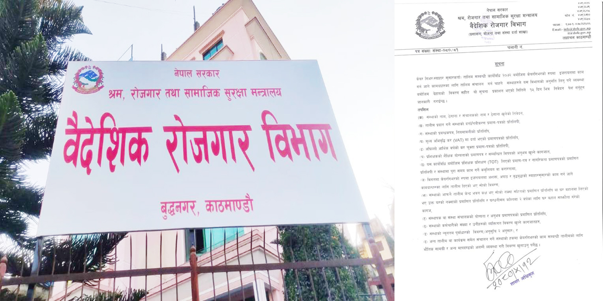 वैदेशिक रोजगार विभागले इजरायलमा केयर गिभरको तालिम दिने संस्थाहरुले विभागको अनुमति लिनुपर्ने बताएको छ । विभागले अनुमतिका लागि आवेदन दिन बुधबार १५ दिने सूचना जारी गरेको हो ।