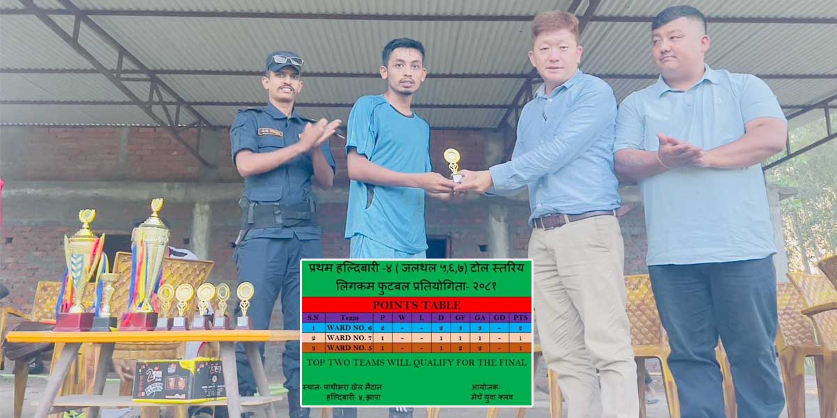 झापाको हल्दीवारी वडा नम्बर ४ मा मेचे युवा क्लबको आयोजनामा भएको प्रथम हल्दीवारी टोलस्तरीय लिगकम फुटवल प्रतियोगिताको आजको खेल २÷२ गोलको बराबरीमा टुुङ्गीएको छ । हल्दीबारी–४ को पाथिभरा खेल मैदानमा हुँदै गरेको खेल बर्षाका कारण ढिलो गरी शुरु भएको थियो । आज (आइतवार) को खेलमा जलथल ५ र जलथल ६ बिच प्रतिस्पर्धा भएको थियो ।