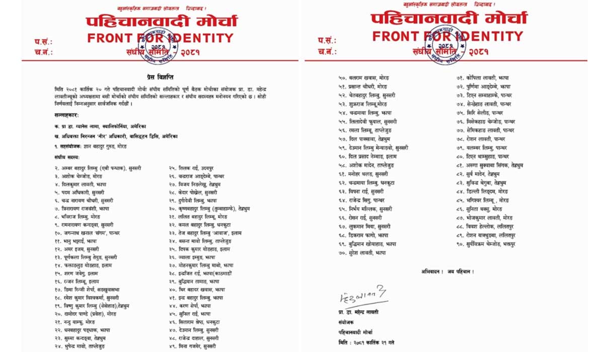 पहिचानवादी मोर्चा संघीय समितिले सल्लाहकार र संघीय सदस्यहरु मनोनयन गरेको छ । मेचीका संयोजक प्रा.डा. महेन्द्र लावतीको अध्यक्षतामा बसेको मोर्चाको पूर्ण बैठकले सल्लाहकार र संघीय सदस्यहरु मनोनयन गरेको हो ।