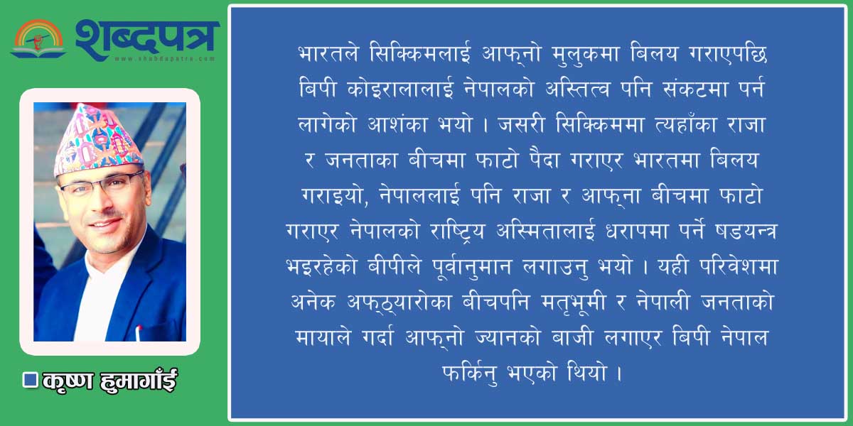 १.भारतले सिक्किमलाई आफ्नो मुलुकमा बिलय गराएपछि बिपी कोइरालालाई नेपालको अस्तित्व पनि संकटमा पर्न लागेको आशंका भयो । जसरी सिक्किममा त्याहाँका राजा र जनताका बीचमा फाटो पैदा गराएर भारतमा बिलय गराइयो, नेपाललाई पनि राजा र आफ्ना बीचमा फाटो गराएर नेपालको राष्ट्रिय अस्मितालाई धरापमा पर्ने षडयन्त्र भइरहेको बीपीले पूर्वानुमान लगाउनु भयो । यही परिवेशमा अनेक अफ्ठ्यारोका बीचपनि मतृभूमी र नेपाली जनताको मायाले गर्दा आफ्नो ज्यानको बाजी लगाएर बिपी नेपाल फर्किनु भएको थियो ।