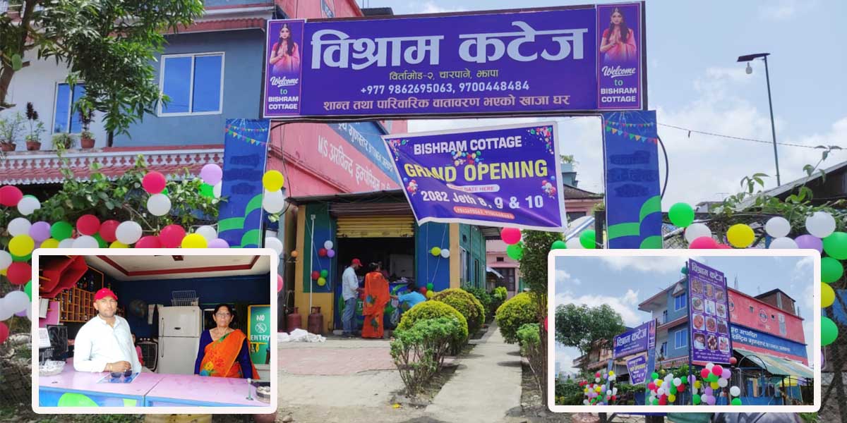 झापाको बिर्तामोड नगरपालिका–२ स्थित चारपाने चोकमा विश्राम कटेज सञ्चालनमा आएको छ । चारपानेका स्थानीय युवा व्यवसायी खेमराज गिरीको एकल लगानीमा कटेज सञ्चालनमा आएको हो ।